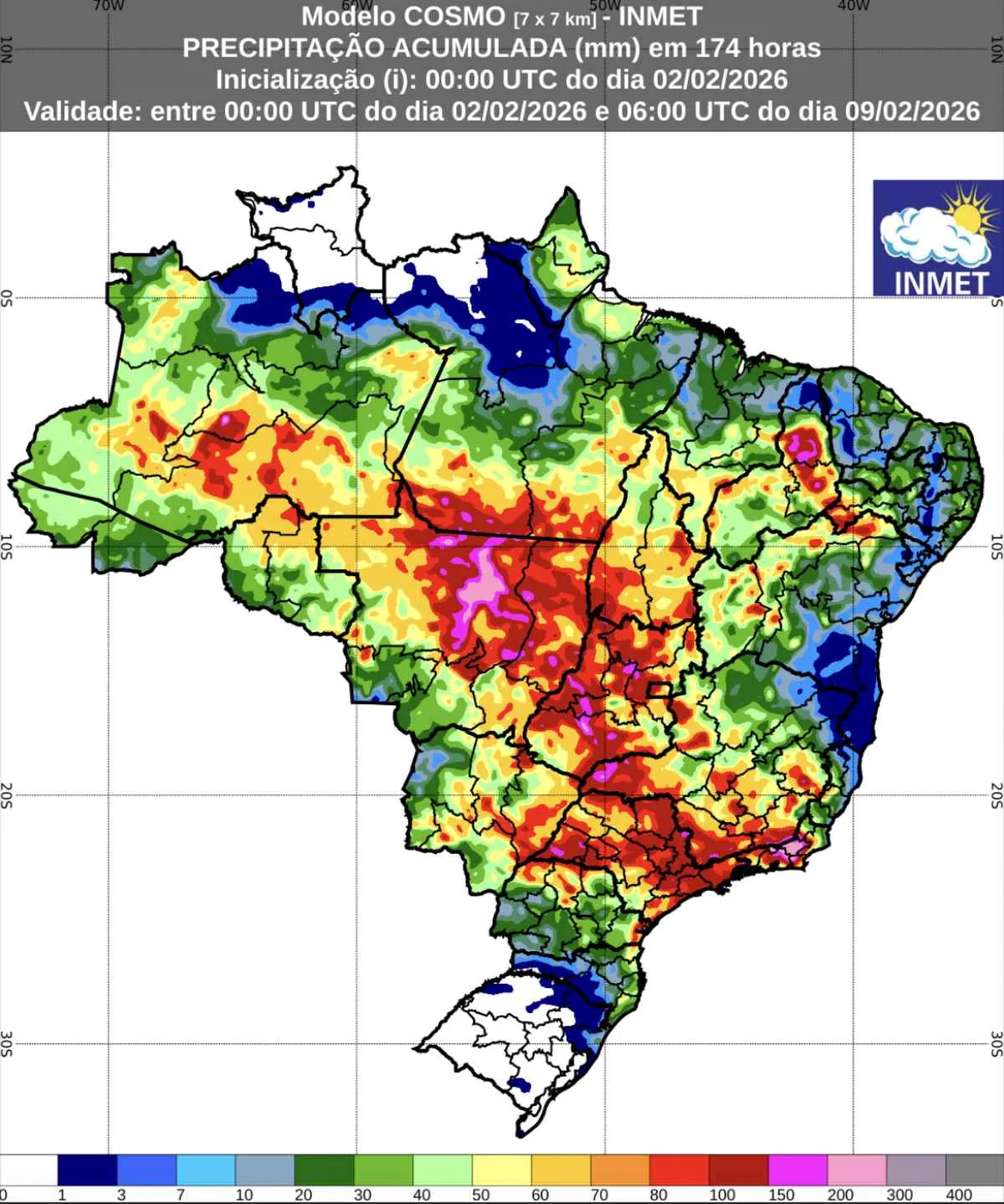 Previsão de chuva acumulada (2 a 9 de fevereiro de 2026). Foto: INMET / Divulgação